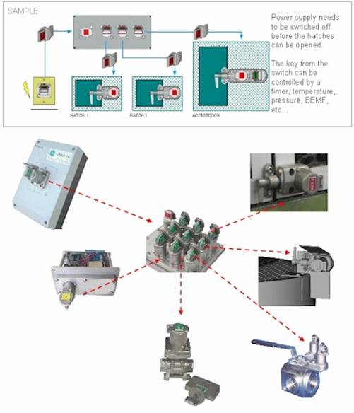 機械設(shè)備的安全防護和閥門連鎖類似,也是一個鑰匙管理系統(tǒng)。很多情況下工作間的門和電源開關(guān)需要被加入到鎖定的序列。